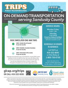 Need a lift? Call TRIPS Public Transportation. TRIPS provides low-cost rides for Sandusky County residents for shopping trips, doctors' appointments and anywhere they may need to go within the county. Vehicles are handicap accessible.